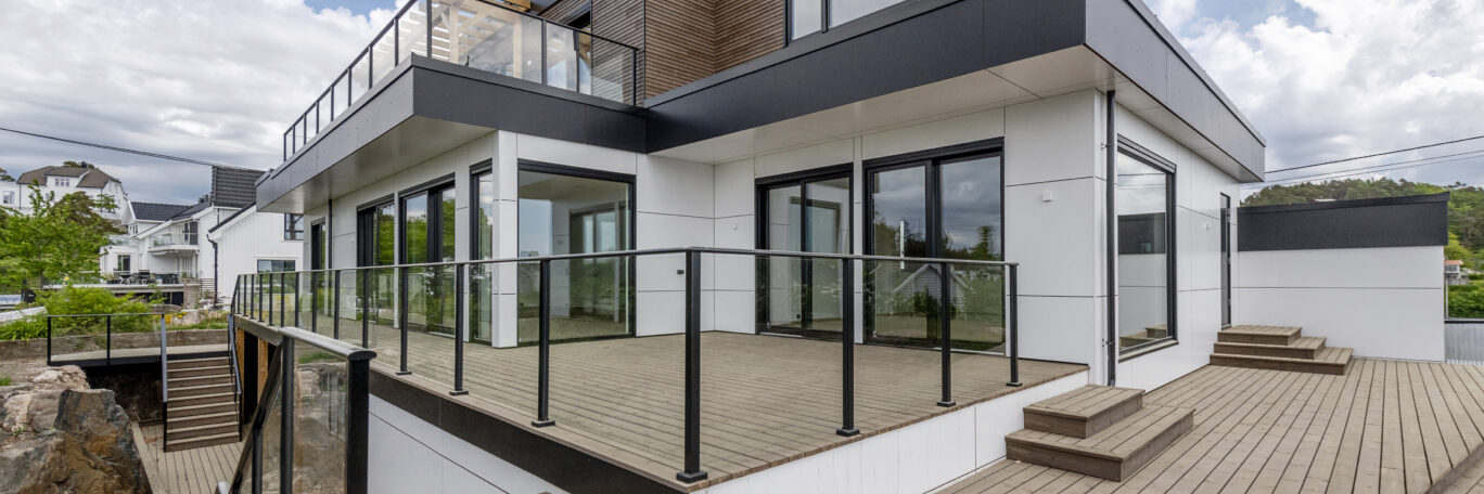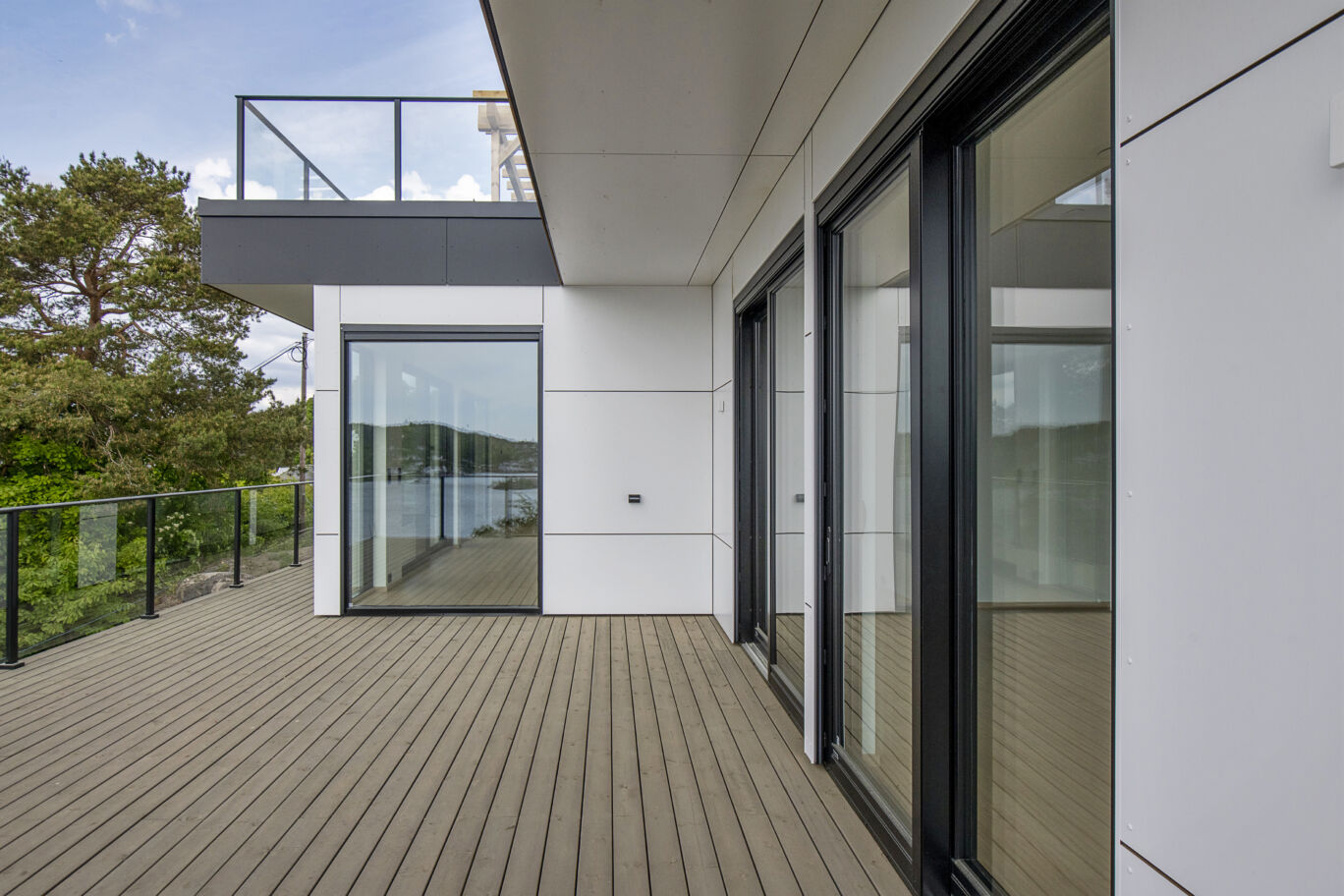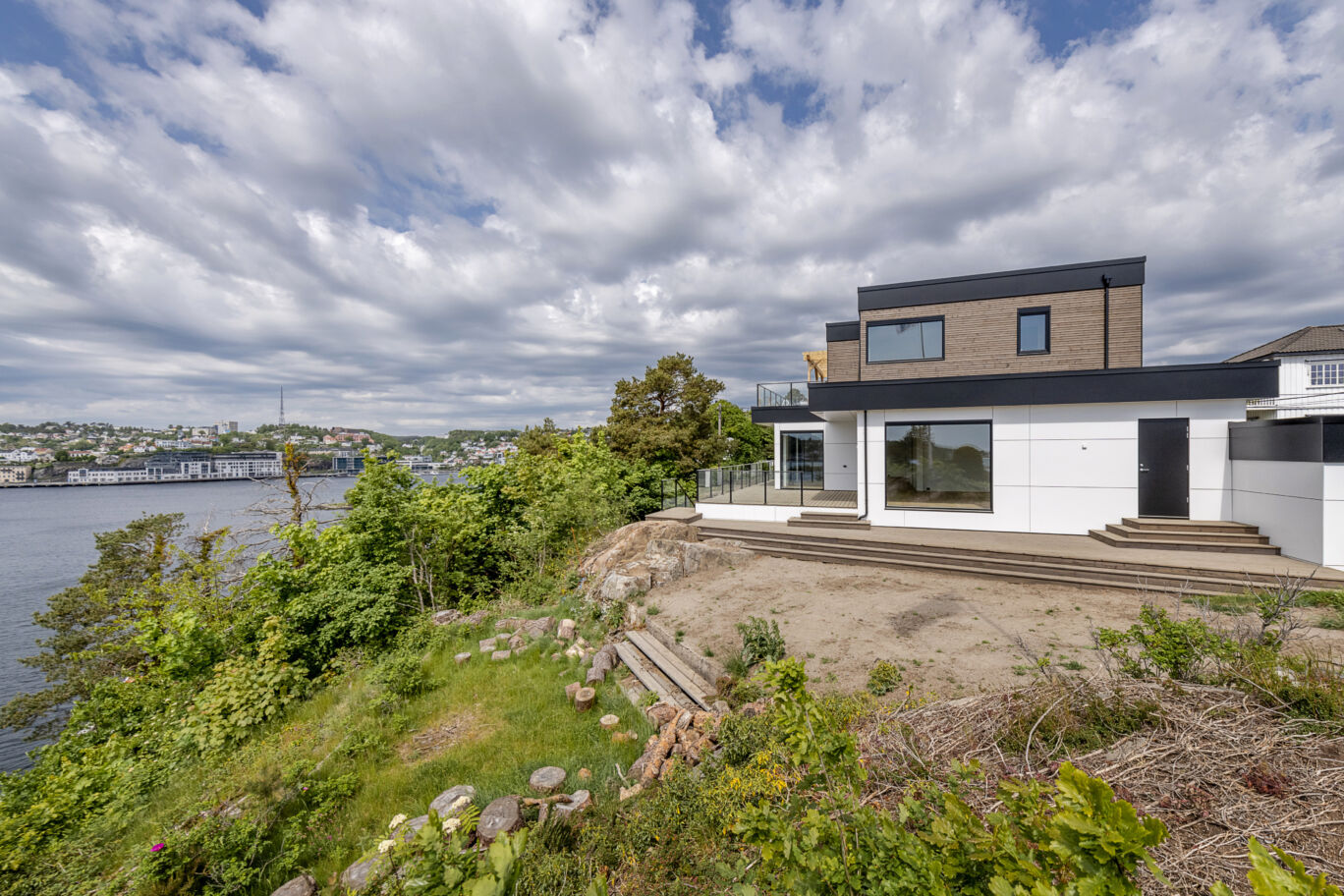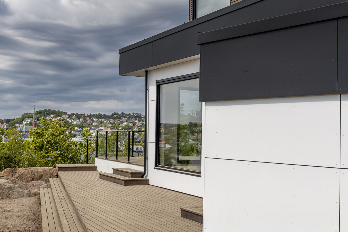 På Tromøya i Norge ligger et moderne og luksuriøst parcelhus med panoramaudsigt over havet. Her har ejeren og arkitekterne skabt et hjem, der både udnytter den vilde natur og kombinerer funktionalitet med elegant design. Huset er på tre etager med næsten 450 m2 bolig. Lige over 50 meter fra havet stiller omgivelserne høje krav til byggematerialerne. Salte havvinde, fugt og vejrlig kan slide på en facade, og derfor valgte byggeriet facadebeklædning fra Rockpanel, der både opfylder de æstetiske ønsker og de praktiske krav til et havnært miljø.