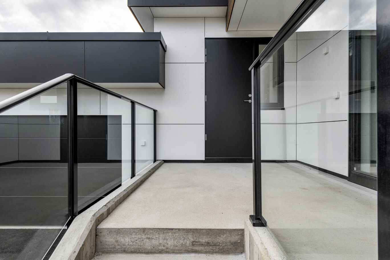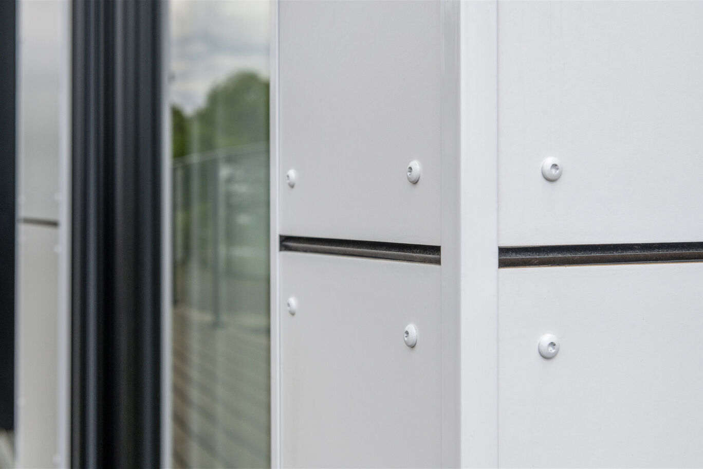 I tæt samarbejde mellem bygherre, entreprenør og arkitekter blev projektet planlagt med fokus på kvalitet og funktion. Facaden blev udført med Rockpanel Colours (RAL 9003 og RAL 9005), som giver et moderne, minimalistisk og tidløst udtryk. De hvide og sorte plader blev kombineret med en varm træbeklædning på husets øverste etage for at skabe balance og harmoni i designet.
